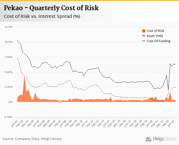 Pekao's Cost of Risk (loan loss provisions as % of total assets) amounted to 0.216% in the third quarter of 2023, down from 0.404% when compared to the previous quarter.