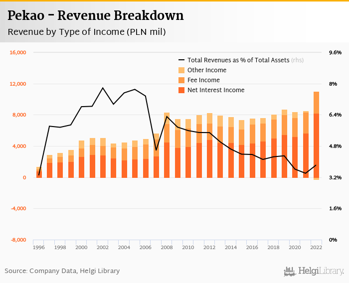Historically, the bank’s revenues containing of interest, fee and other non-interest income reached an all time high of PLN 10,761 mil in 2022 and an all time low of PLN 1,393 mil in 1996. The average revenue in the last five years amounted to PLN 8,913 mil.