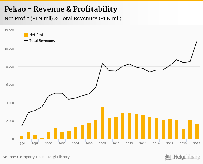 Pekao made a net profit of PLN 1,719 mil under revenues of PLN 10,761 mil in 2022, up -21.0% and 26.3% respectively compared to the previous year.