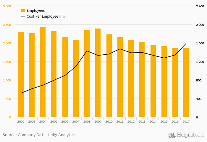 Staff cost represented of sales in 2017, 0 pp higher than a decade ago.
