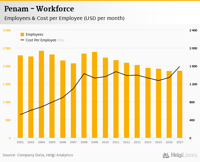 Penam employed 1,875 employees in 2017, up 0.482% compared to the previous year. Historically, between 2002 and 2017, the firm's workforce hit a high of 2,432 employees in 2004 and a low of 1,866 employees in 2016.