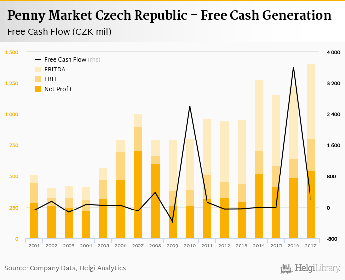 Penny Market Czech Republic made a net profit of CZK 542 mil with revenues of CZK 33,866 mil in 2017, up by 11.2% and up by 5.88%, respectively, compared to the previous year. This translates into a net margin of 1.60%.