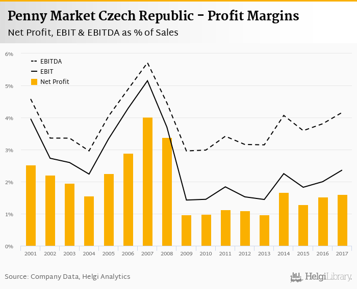 Penny Market Czech Republic made a net profit of CZK 542 mil with revenues of CZK 33,866 mil in 2017, up by 11.2% and up by 5.88%, respectively, compared to the previous year.