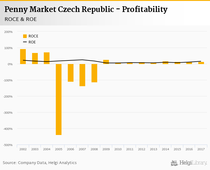 Penny Market Czech Republic made a net profit of CZK 542 mil in 2017, up 11.2% compared to the previous year. Historically, between 2001 and 2017, the company's net profit reached a high of CZK 704 mil in 2007 and a low of CZK 220 mil in 2004.