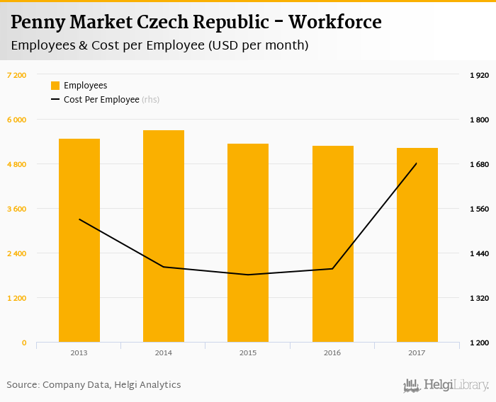 Penny Market Czech Republic employed 5,234 employees in 2017, down 1.23% compared to the previous year. Historically, between 2013 and 2017, the firm's workforce hit a high of 5,716 employees in 2014 and a low of 5,234 employees in 2017.