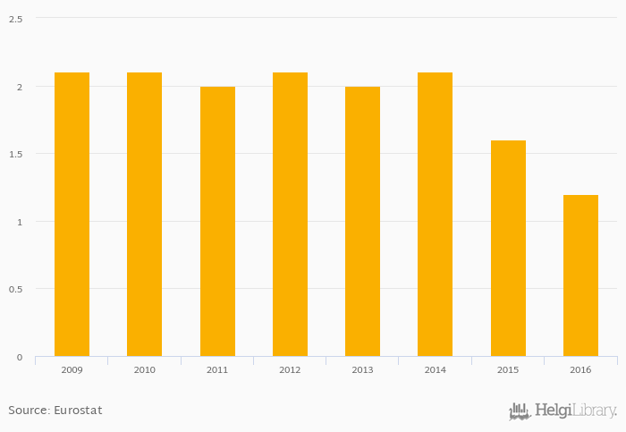 Persons in-work at-risk-of-poverty rate by age and sex - 18 years or over - Females - Employees fell 25.0% to 1.20 in Finland in 2016, according to Eurostat, SILC.