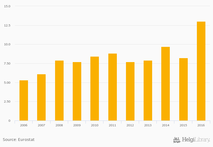 Historically, Persons in-work at-risk-of-poverty rate by age and sex - 18 years or over - Males - Employed persons in Bulgaria reached an all time high of 13.0 in 2016 and an all time low of 5.30 in 2006.