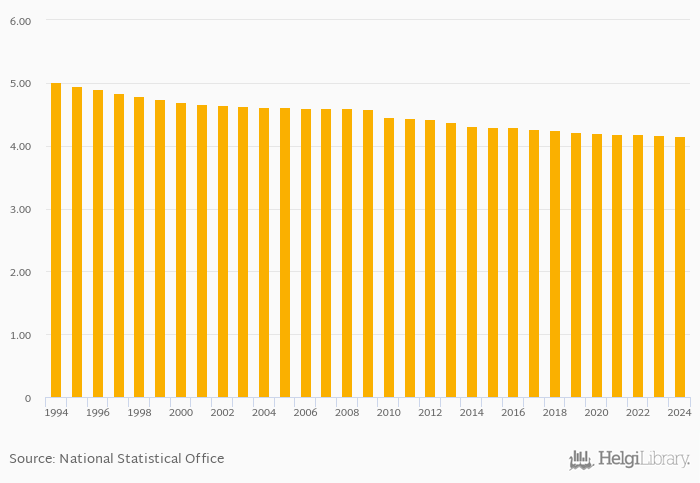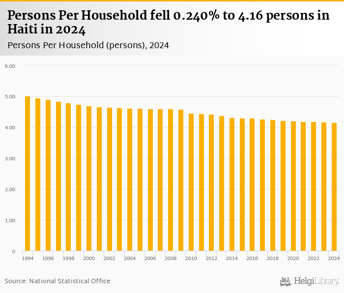 Persons per household fell 0.240% to 4.16 persons in Haiti in 2024, according to the National Statistical Office.
