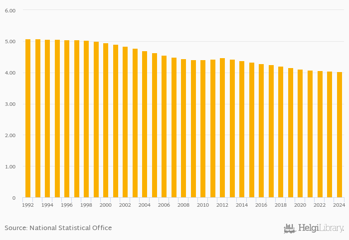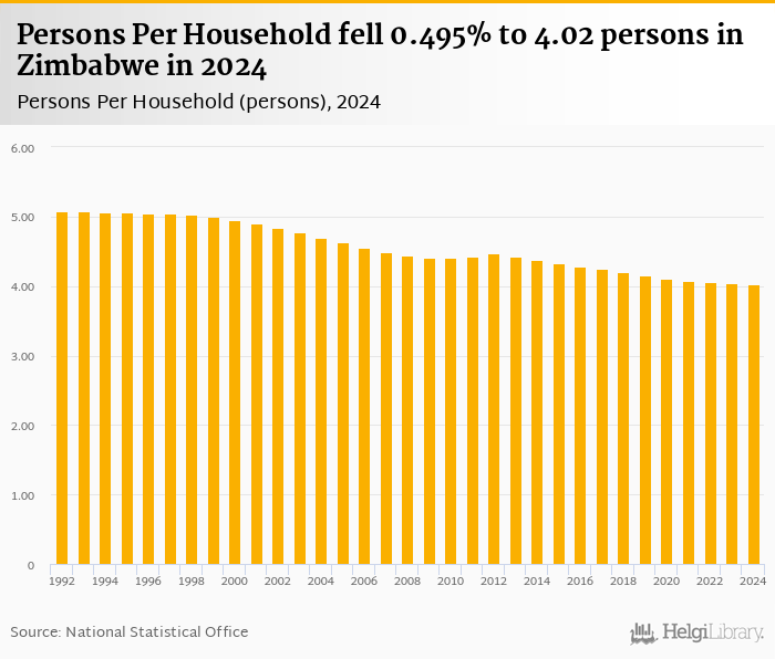 Persons per household fell 0.495% to 4.02 persons in Zimbabwe in 2024, according to the National Statistical Office.