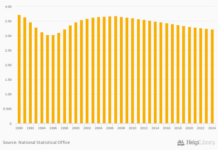 Persons per household fell 0.617% to 3.22 persons in Bosnia and Herzegovina in 2024, according to the National Statistical Office.
