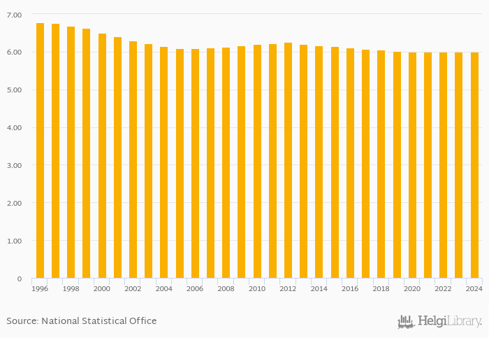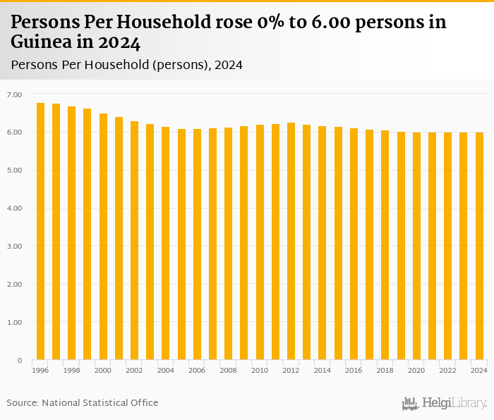 Persons per household rose 0% to 6.00 persons in Guinea in 2024, according to the National Statistical Office.