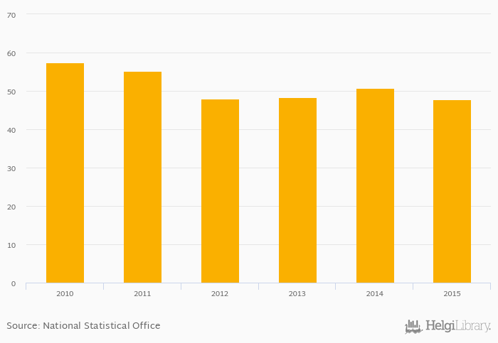 Historically, petrol passenger cars as a share of total cars in Portugal reached an all time high of 57.3% in 2010 and an all time low of 47.8% in 2015.