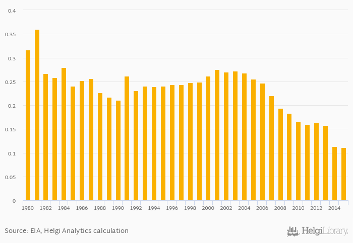 Petroleum consumption as a share of worldwide consumption fell 1.86% to 0.111% in Puerto Rico in 2015, according to EIA.