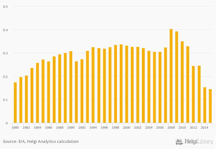 Petroleum consumption as a share of worldwide consumption fell 4.75% to 0.146% in Syria in 2015, according to EIA.