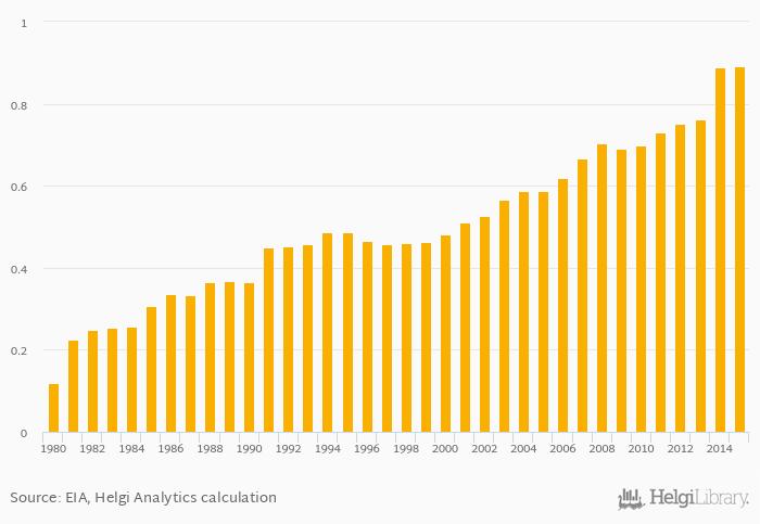 Petroleum consumption as a share of worldwide consumption rose 0.244% to 0.890% in United Arab Emirates in 2015, according to EIA.