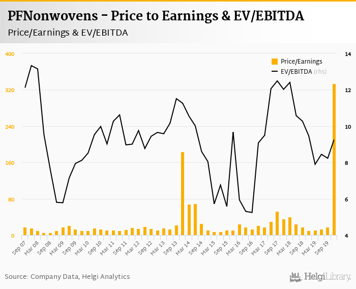 PFNonwovens stock traded at CZK 700 per share at the end 4Q2019 translating into a market capitalization of USD 271 mil.