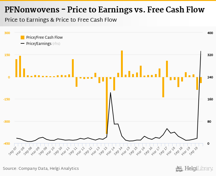 Regarding cash generated defined by the sum of net profit and depreciation, the stock traded at 7.13x at the end of 4Q2019. When investments are excluded to get free cash flow, PFNonwovens traded at -40.9x.