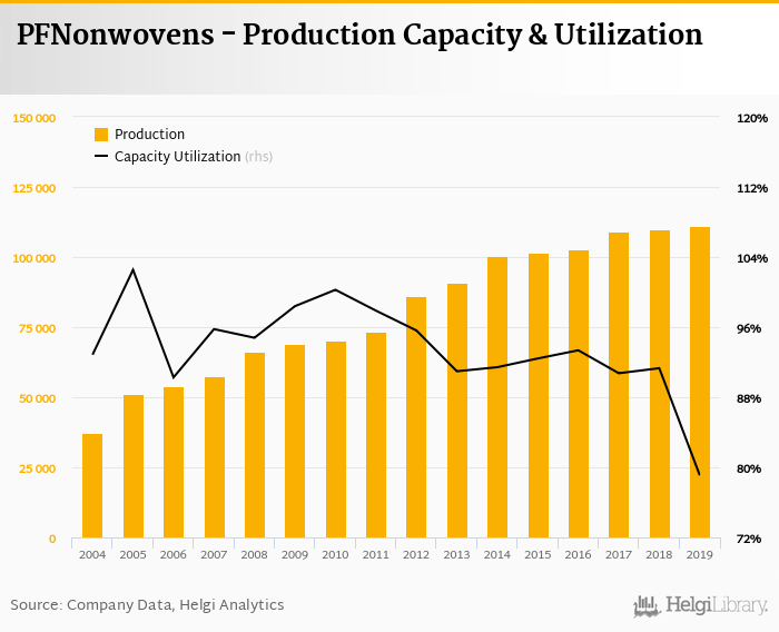 The company produced total of 110,966 tonnes of nonwovens textile in 2019, up 1.02% when compared to a year earlier. The figure is 61.1% higher than a decade ago implying an average annual growth in production of 4.89% in 2009 - 2019. The production figure means PFNonwovens used 140,300 tonnes of its production capacity in 2019. In the last five years, the average capacity utilization reached impressive 79.1%.