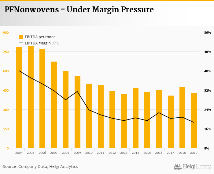 Having said that, PFNonwovens has been able to offset the margin pressure by volume growth and efficiency gains, so EBITDA in absolute terms has grown by an average 2.03% in the last decade.