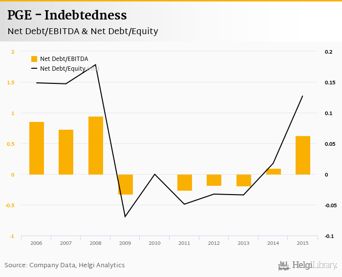 PGE's net debt stood at PLN 5,161 mil and accounted for 0.128 of equity at the end of 2015. The ratio is up 0.110 pp compared to the previous year.