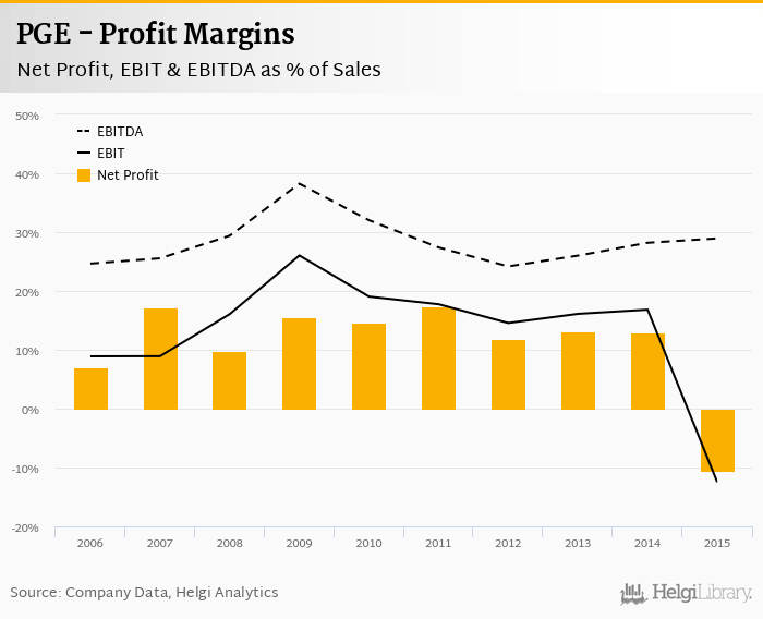 PGE made a net profit of PLN -3,032 mil with revenues of PLN 28,542 mil in 2015, down by 183% and up by 1.42%, respectively, compared to the previous year.
