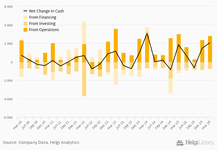 Cash from financing amounted to PLN 16.0 mil, so the company generated PLN 2,054 mil net cash in 1Q2016.