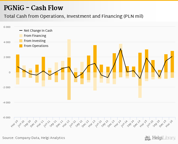 PGNiG's operating cash flow stood at PLN 2,806 mil in 1Q2016, down 6.96% when compared to the previous year. Historically, between 1Q2010 - 1Q2016, the firm’s operating cash flow reached a high of PLN 3,578 mil in 1Q2013 and a low of PLN -825 mil in 3Q2012.