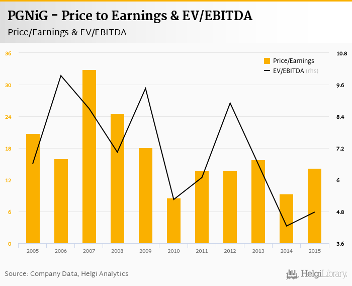 PGNiG stock traded at EUR 5.14 per share at the end 2015 translating into a market capitalization of USD 7,774 mil.