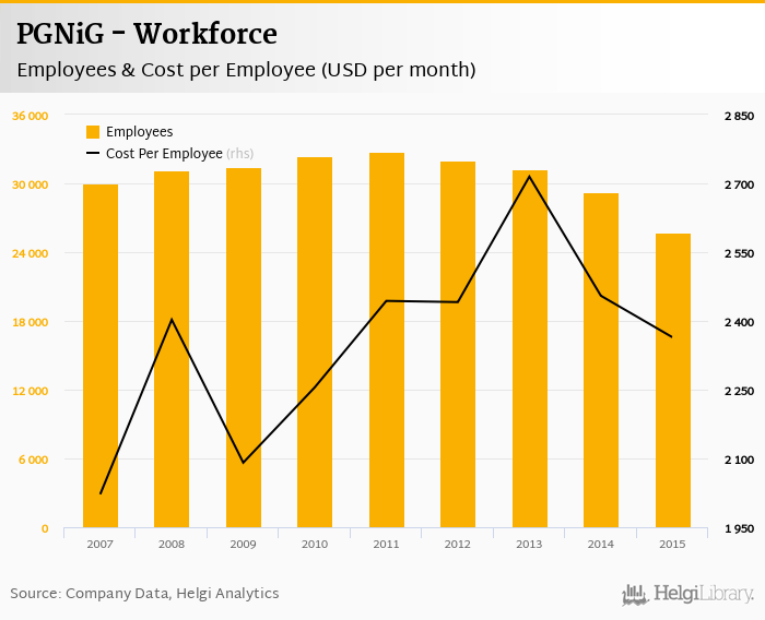 PGNiG employed 25,705 employees in 2015, down 12.2% compared to the previous year. Historically, between 2007 and 2015, the firm's workforce hit a high of 32,783 employees in 2011 and a low of 25,705 employees in 2015.
