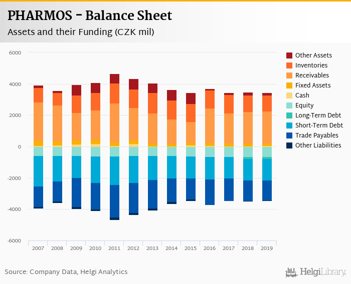 PHARMOS's total assets reached CZK 3,460 mil at the end of 2019, down 0.661% compared to the previous year.