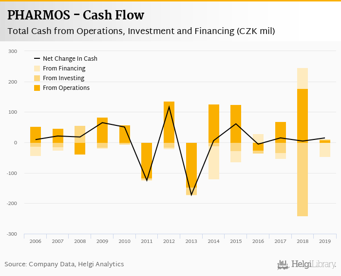 Cash from financing amounted to CZK -46.1 mil, so the company generated CZK 14.7 mil net cash in 2019.