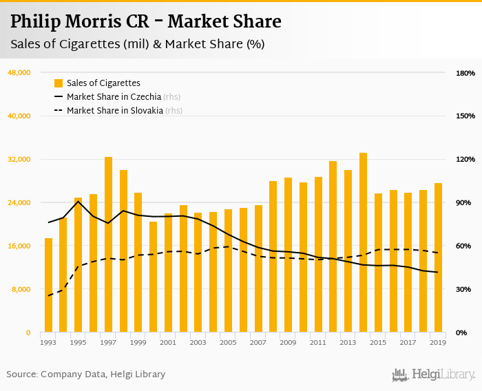 In Slovakia, the company sold 4,400 mil pieces of cigarettes, That is up 3.02% yoy. The figure represents a 12.8% increase when compared to a decade ago when 3,900 mil pieces have been shipped. In 2018, Philip Morris held 54.8% of the market share in Slovakia, down 1.6 pp when compared to a previous year.