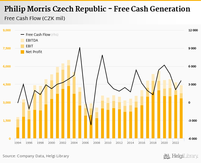 The company generated cash, defined by a sum of net profit and depreciation, of CZK 4,015 mil or 19.5% of sales. When investments are excluded, free cash flow reached CZK 3,622 mil, or 17.6% of sales in 2023.