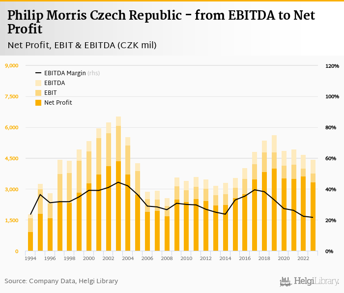 Philip Morris Czech Republic made a net profit of CZK 3,343 mil with revenues of CZK 20,570 mil in 2023, down by 8.03% and down by 1.8%, respectively, compared to the previous year. This translates into a net margin of 16.3%.