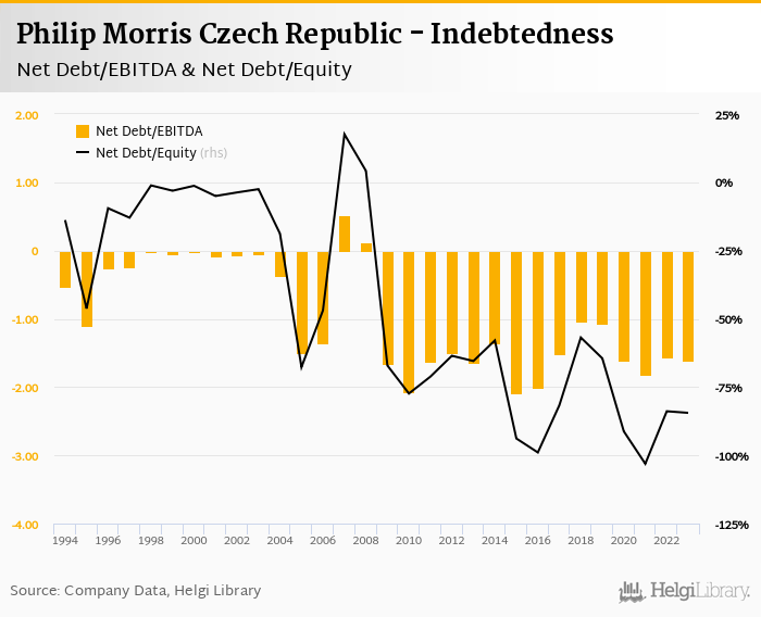 Philip Morris Czech Republic's net debt stood at CZK -7,192 mil and accounted for -84.4% of equity at the end of 2023. The ratio is down 0.585 pp compared to the previous year.