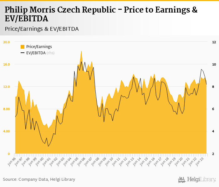 Philip Morris Czech Republic stock traded at CZK 15,620 per share at the end 4Q2023 translating into a market capitalization of USD 1,916 mil.