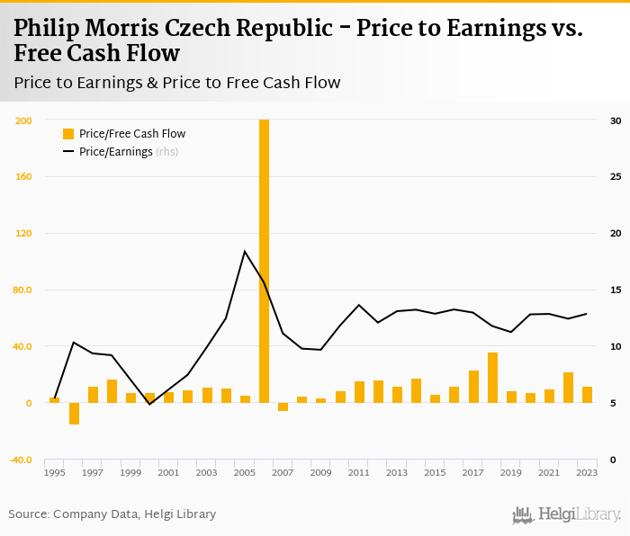 Regarding cash generated defined by the sum of net profit and depreciation, the stock traded at 10.7x at the end of 2023. When investments are excluded to get free cash flow, Philip Morris Czech Republic traded at 11.8x.