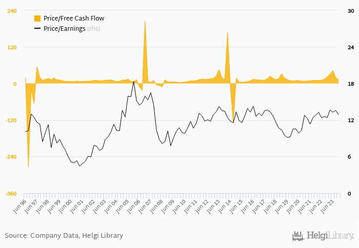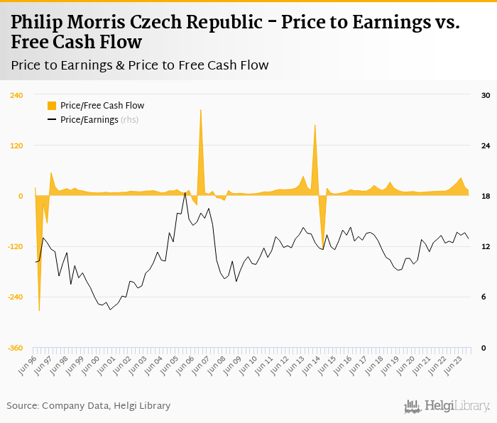 Regarding cash generated defined by the sum of net profit and depreciation, the stock traded at 10.7x at the end of 4Q2023. When investments are excluded to get free cash flow, Philip Morris Czech Republic traded at 11.8x.