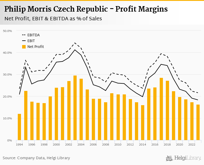 Philip Morris Czech Republic made a net profit of CZK 3,343 mil with revenues of CZK 20,570 mil in 2023, down by 8.03% and down by 1.80%, respectively, compared to the previous year.
