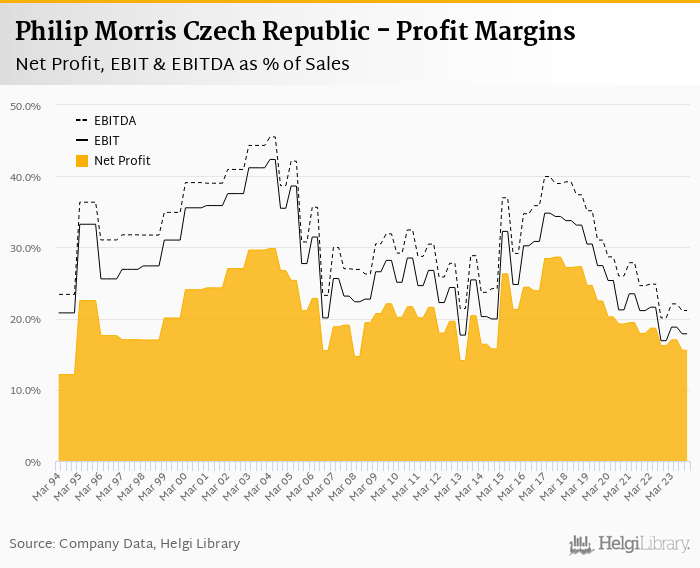 Philip Morris Czech Republic made a net profit of CZK 845 mil with revenues of CZK 5,430 mil in 4Q2023, down by 6.37% and down by 2.50%, respectively, compared to the previous year.