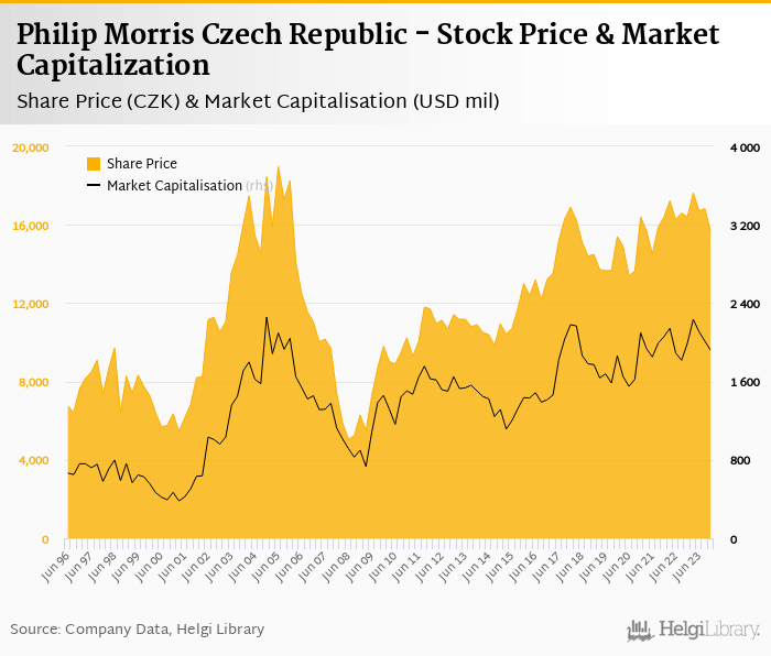 Philip Morris Czech Republic stock traded at CZK 15,620 per share at the end 4Q2023 implying a market capitalization of USD 1,916 mil.