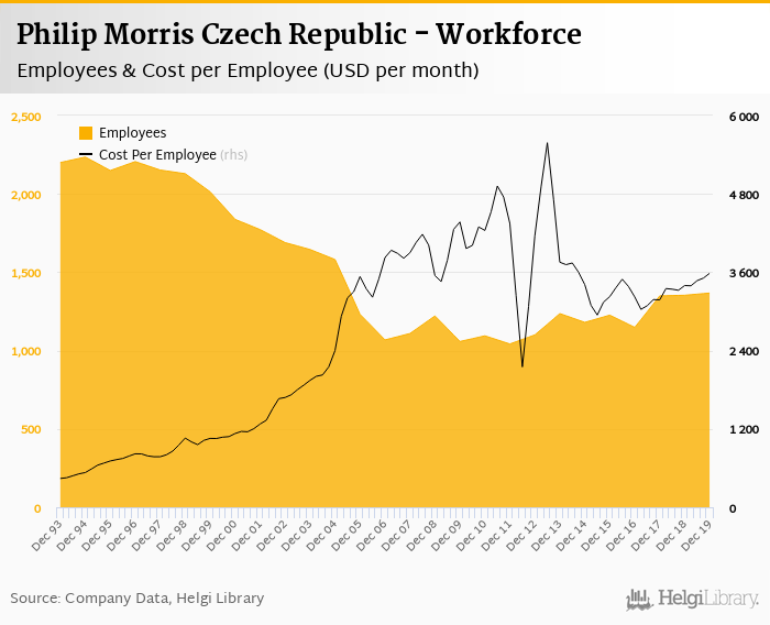 Philip Morris Czech Republic employed 1,367 employees in 4Q2019, up 1.03% compared to the previous year. Historically, between 4Q1993 and 4Q2019, the firm's workforce hit a high of 2,235 employees in 4Q1994 and a low of 1,042 employees in 4Q2011.