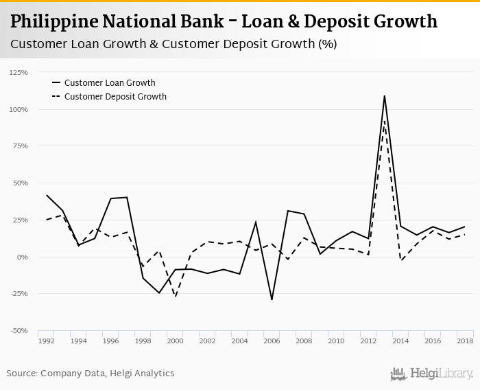Philippine National Bank's customer loan growth reached 20.2% in 2018, up from 16.2% compared to the previous year. Historically, the bank’s loans growth reached an all time high of 109% in 2013 and an all time low of -29.3% in 2006. In the last decade, the average annual loan growth amounted to 21.8%.