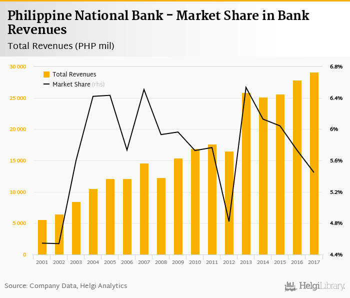 As a result, Philippine National Bank accounted for 5.45% of all bank revenues generated by banks in Philippines in 2017. Historically, the bank’s market share in total revenues reached an all time high of 6.53% in 2013 and an all time low of 4.54% in 2002.