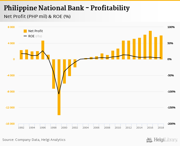 Philippine National Bank made a net profit of PHP 5,926 mil in 2018, up 6.80% compared to the previous year. This implies a return on equity of 4.77%.