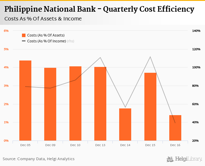 Philippine National Bank's cost to income ratio reached 39.1% in the fourth quarter of 2016, down from when compared to the previous quarter.