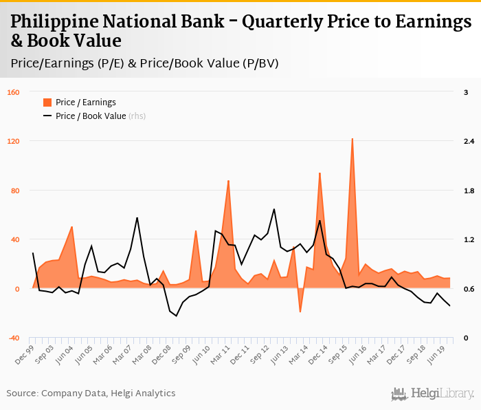 At the end of 3Q2019, the bank traded at price to earnings of 7.96x. Within the last five years, the multiple reached an all time high of 122x in 4Q2015 and an all time low of 7.20x in 3Q2018 with an average of 19.3x.