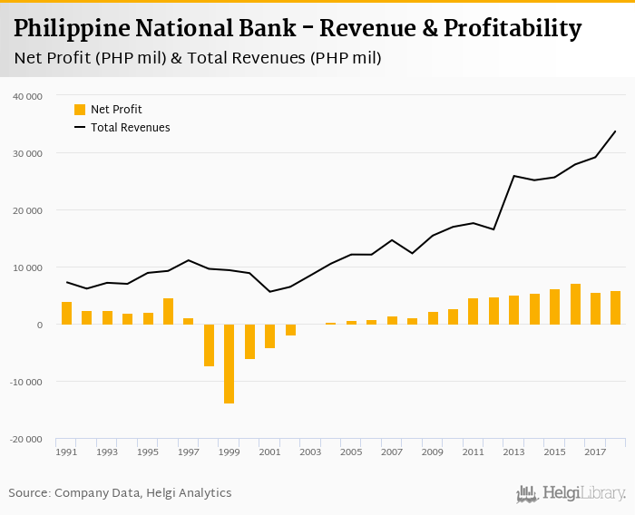Philippine National Bank made a net profit of PHP 5,926 mil under revenues of PHP 33,772 mil in 2018, up 6.80% and 15.9% respectively compared to the previous year.