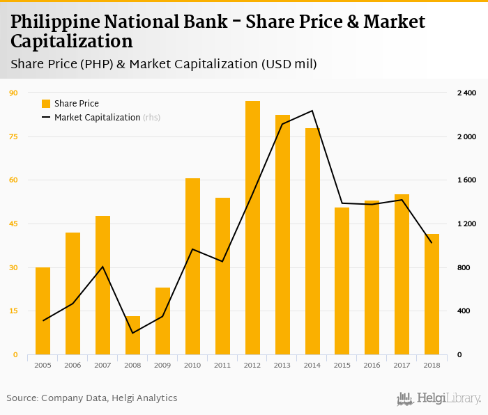 Philippine National Bank stock traded at PHP 41.7 per share at the end of 2018 implying a market capitalization of USD 1,020 mil.