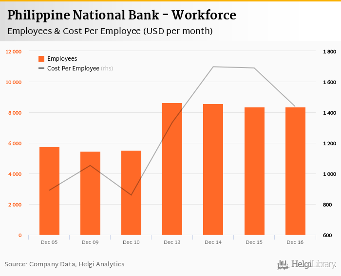Philippine National Bank employed 8,357 persons in 2016-12-31, down 0% when compared to the previous year. Historically, the bank's workforce hit an all time high of 8,634 persons in 2013-12-31 and an all time low of 5,449 in 2009-12-31.